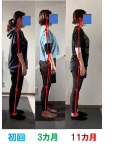 レッスン開始時、3か月目、11カ月目を比較すると11カ月目の時の方が骨盤がしっかりと立ち、ヒップラインが上がっているのが分かります。