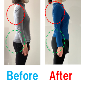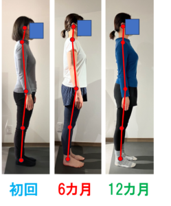経過により初回と比較して胸椎後弯(猫背)が改善し首周りがスッキリしているのが分かります。