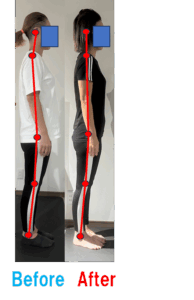 レッスン前の画像ではやや頭頚部が前方にシフトし、胸椎の過後弯、骨盤前方シフトがみてわかります。